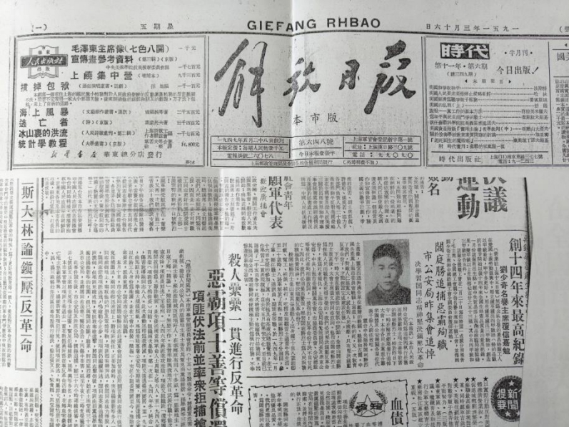 1951年3月16日,解放日报的头版同时刊登了两则消息和一篇短评。一则是《市公安局昨集会追悼阎庭胜烈士》,另一则是《恶霸项士善等伏法》,短评名为《血债血偿》。