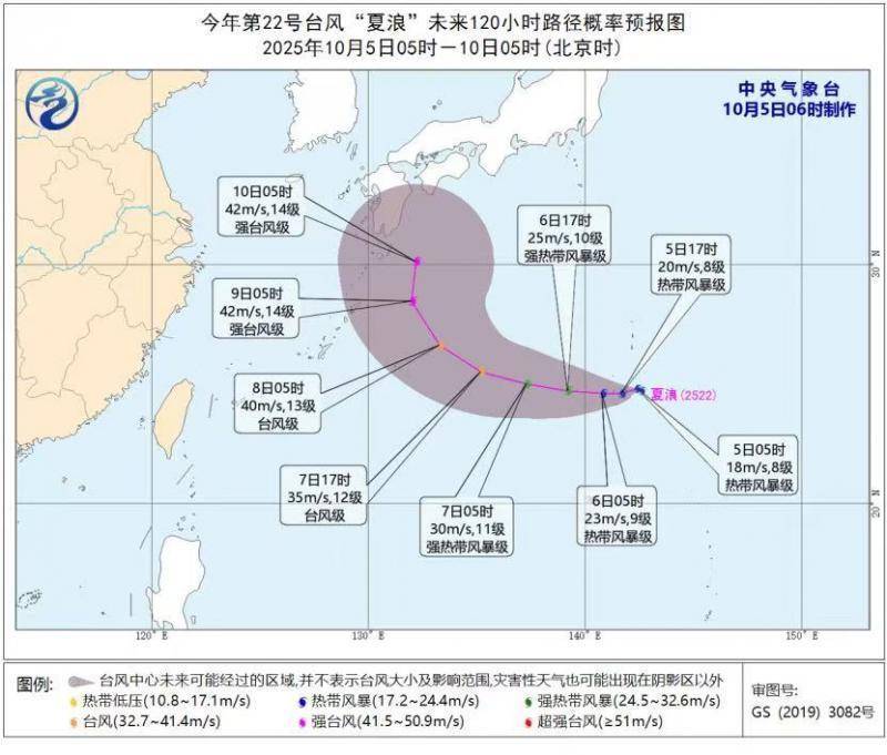 同时,今年第22号台风“夏浪”(热带风暴级;英文名称:Halong;名字来源:越南;意义:越南一海湾名)已于今天凌晨在西北太平洋洋面上生成,早晨5点钟其中心位于日本九州岛东南方向约1430公里的西北太平洋洋面上,就是北纬24.8度、东经142.6度,中心附近最大风力有8级(18米/秒),中心最低气压为998百帕,七级风圈半径100~200公里。预计,“夏浪”将以每小时5~10公里的速度向西偏南方向缓慢移动,强度逐渐加强。
